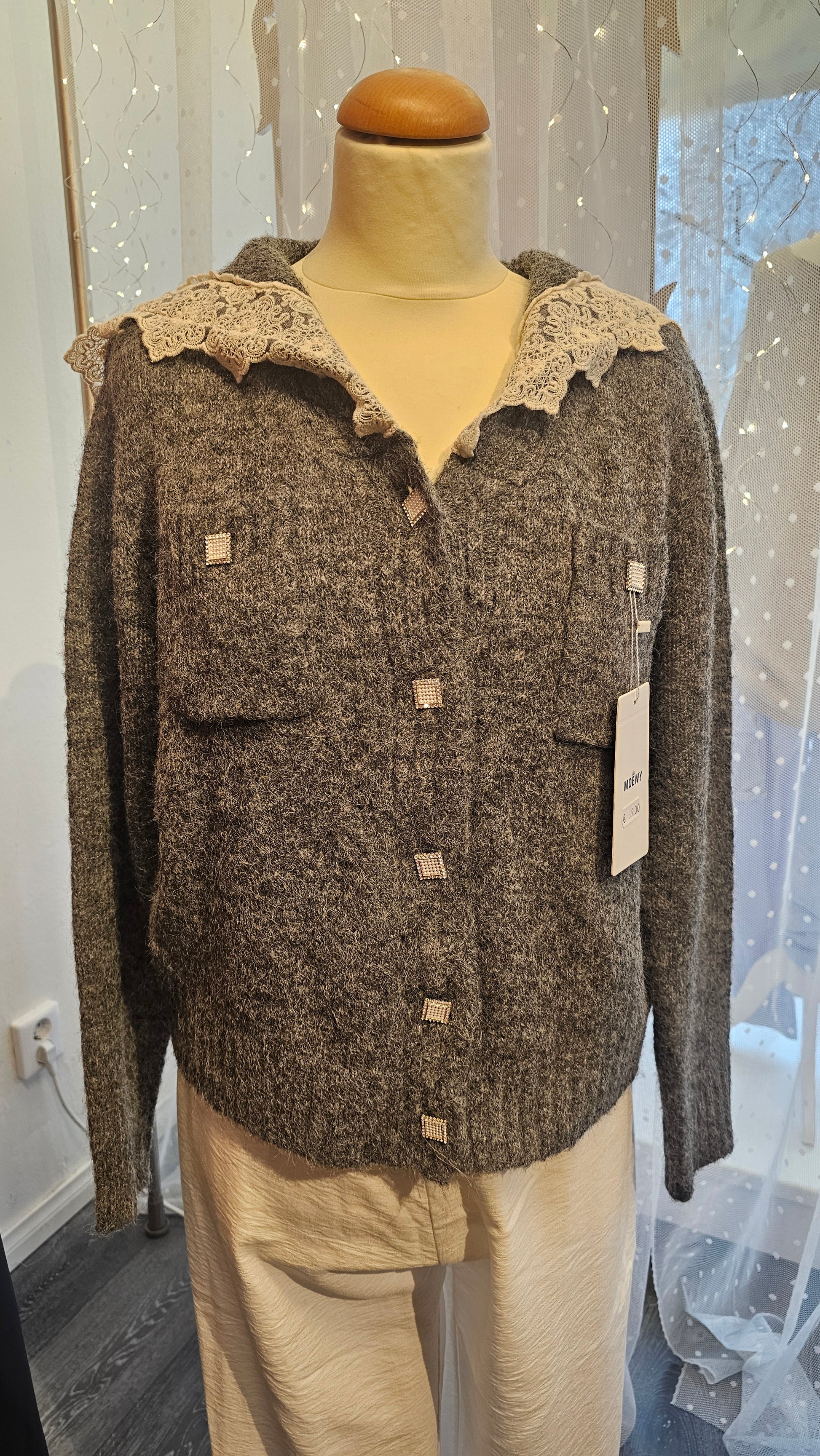 Harmaa neuletakki,jossa kaunis pitsikaulus. Upeat timantti napit saavat arjestakin juhlan. Sopii hyvin käytettäväksi puseronkin tilalta. Edessä rintataskut. Yhden koon. Rinnan ympörys n.120 olka helma 59cm. Pilyester,polyamidi,villa ja elastaani.