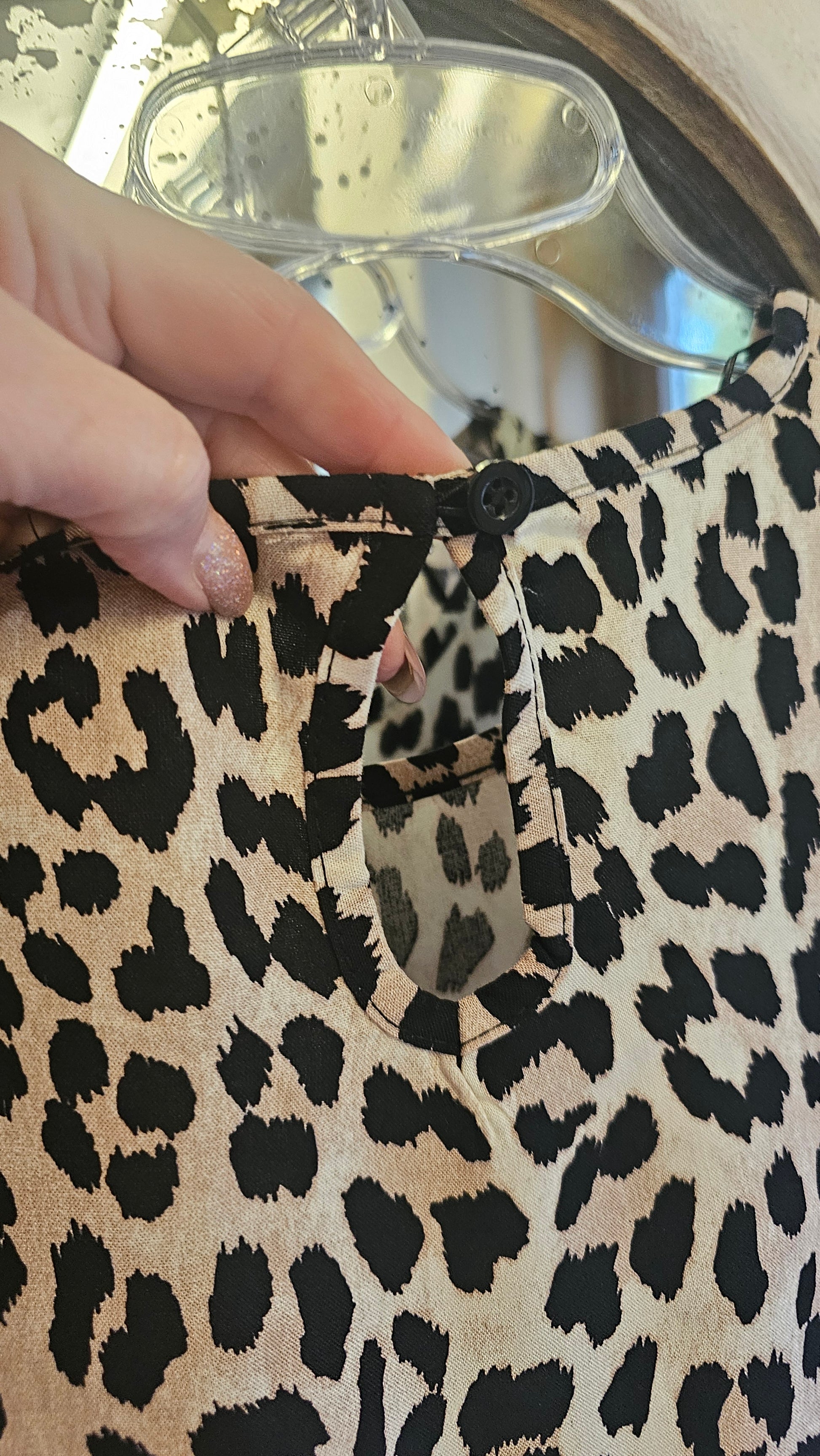 Aina muodikas leopardipusero on hyvä valinta.alaosia muuntelemalla on moneen menoon. Hihat 3/4 osa ja jossa kuminauha. Samoin helman suussa kuminauha peittää hieman kriittistä keskivartaloa. Takana pien kurkistua aukko ja nappi. Kangas pemeää viskoosia.