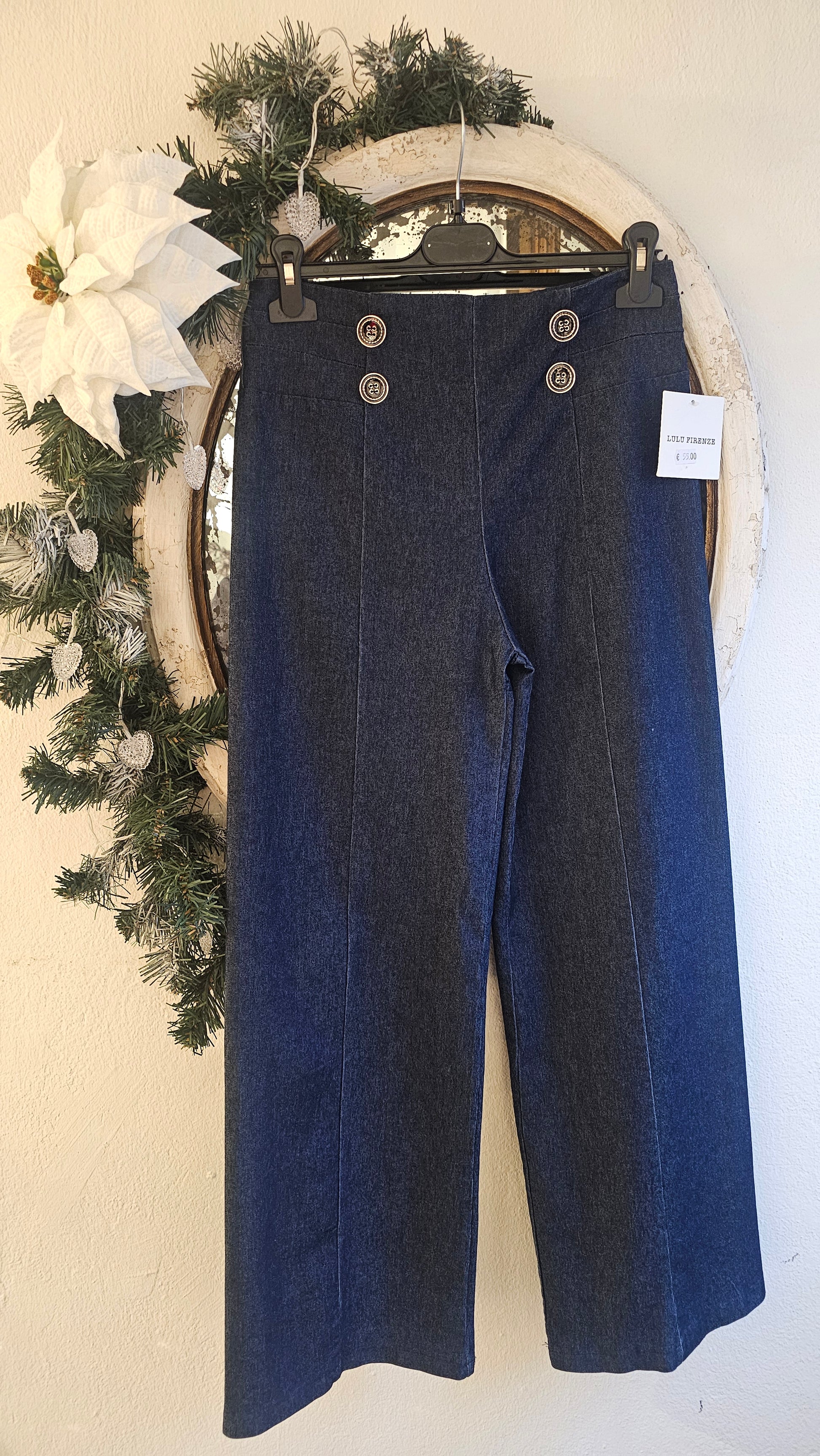 Nämä upeasti leikatut tummansiniset housut yhdistävät klassisen denimlookin ja modernin, siistin siluetin. Etuosan näyttävät koristenapit tuovat asuun merihenkistä eleganssia ja tekevät housuista täydellisen vaihtoehdon, kun haluat pukeutua rennon tyylikkäästi mutta huolitellusti. Suora lahje ja kauniisti laskeutuva materiaali viimeistelevät kokonaisuuden, joka imartelee monenlaista vartalomallia.