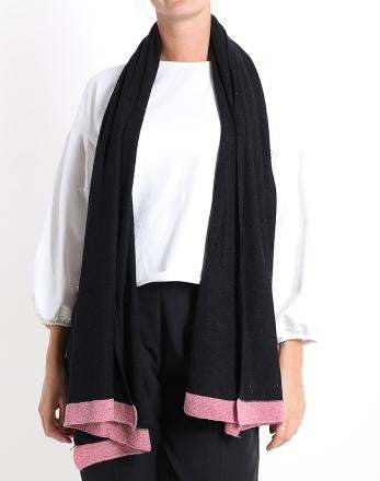 Musta huivi jossa mageet pinkki/hopea reunukset. Villaa,viskoosia,polyamidia ja kashmiria.