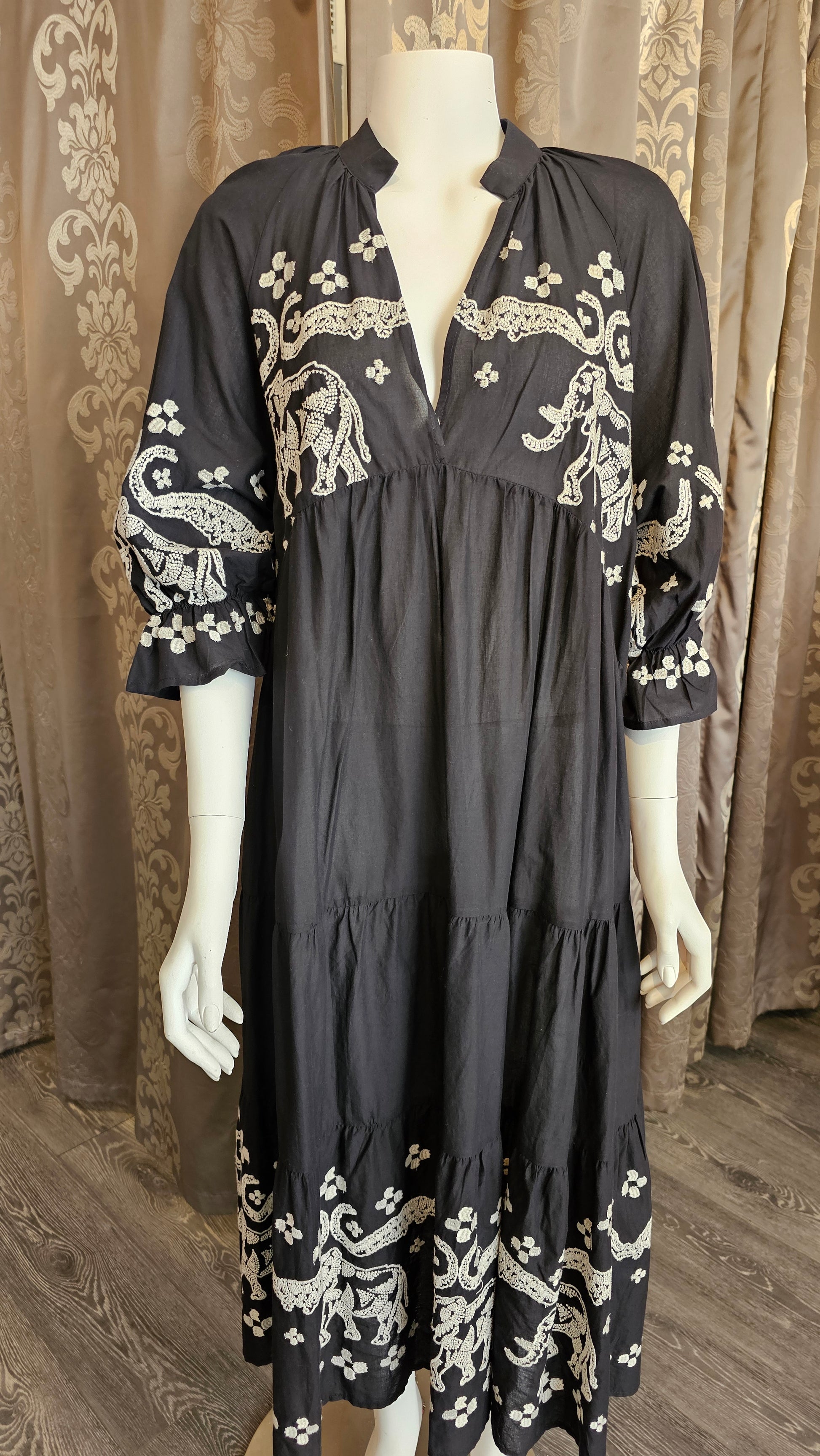Tyylikäs musta mekko kauniilla vaalealla kirjailulla tuo asuusi ripauksen boheemia eleganssia. Kevyt ja ilmava materiaali tekee mekosta miellyttävän käyttää, ja väljä, kerrostettu malli laskeutuu kauniisti eri vartalotyypeille. 3/4-pituiset hihat sekä V-pääntie tuovat ilmeeseen rentoa naisellisuutta.
