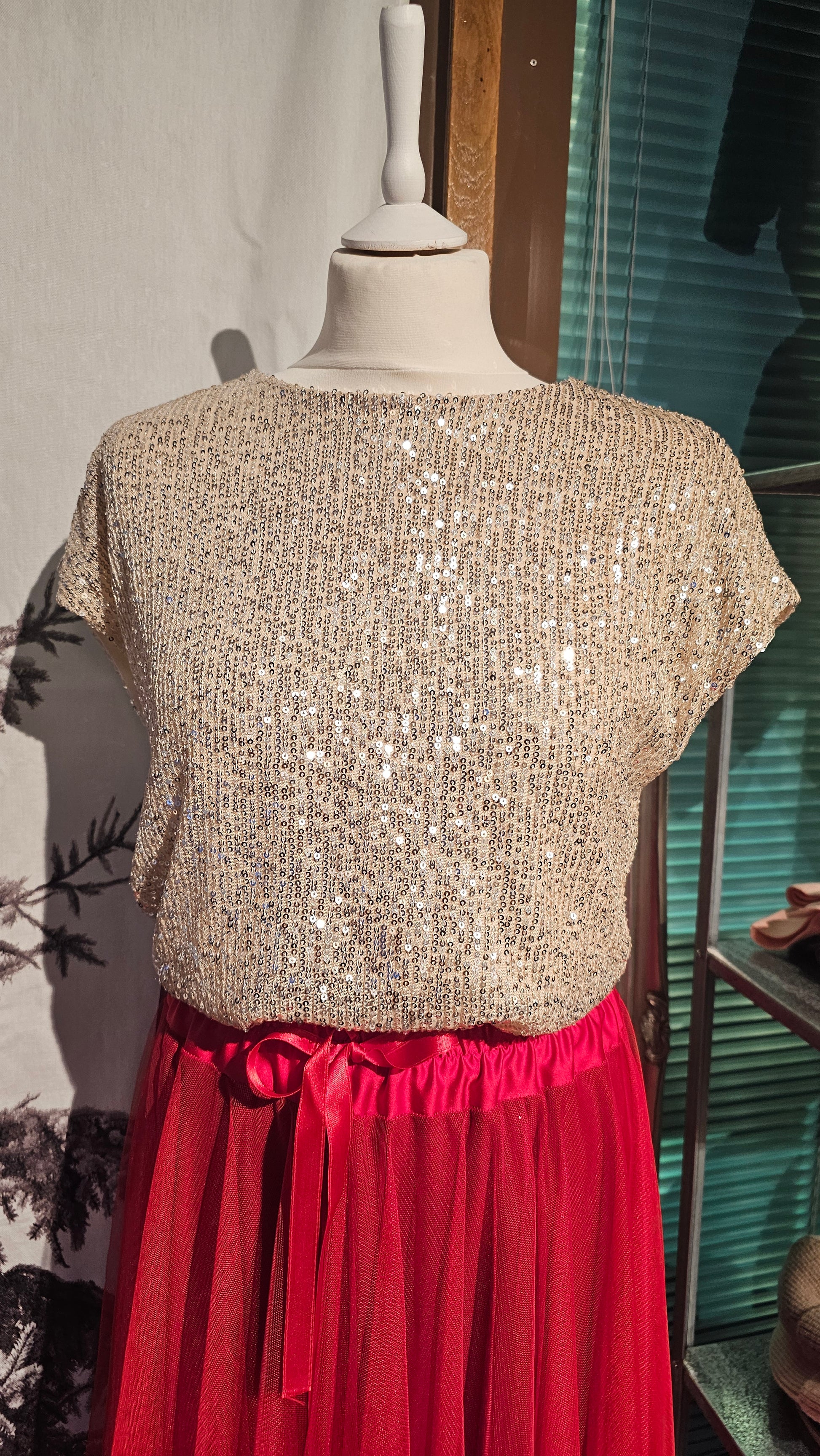 Moniin juhliin sopiva paljetti pusero. Yhdistä kauniin sifonki hameen kanssa tai syorien juhlahousujen. Pienet hihat. Takana nappi kiinnitys.