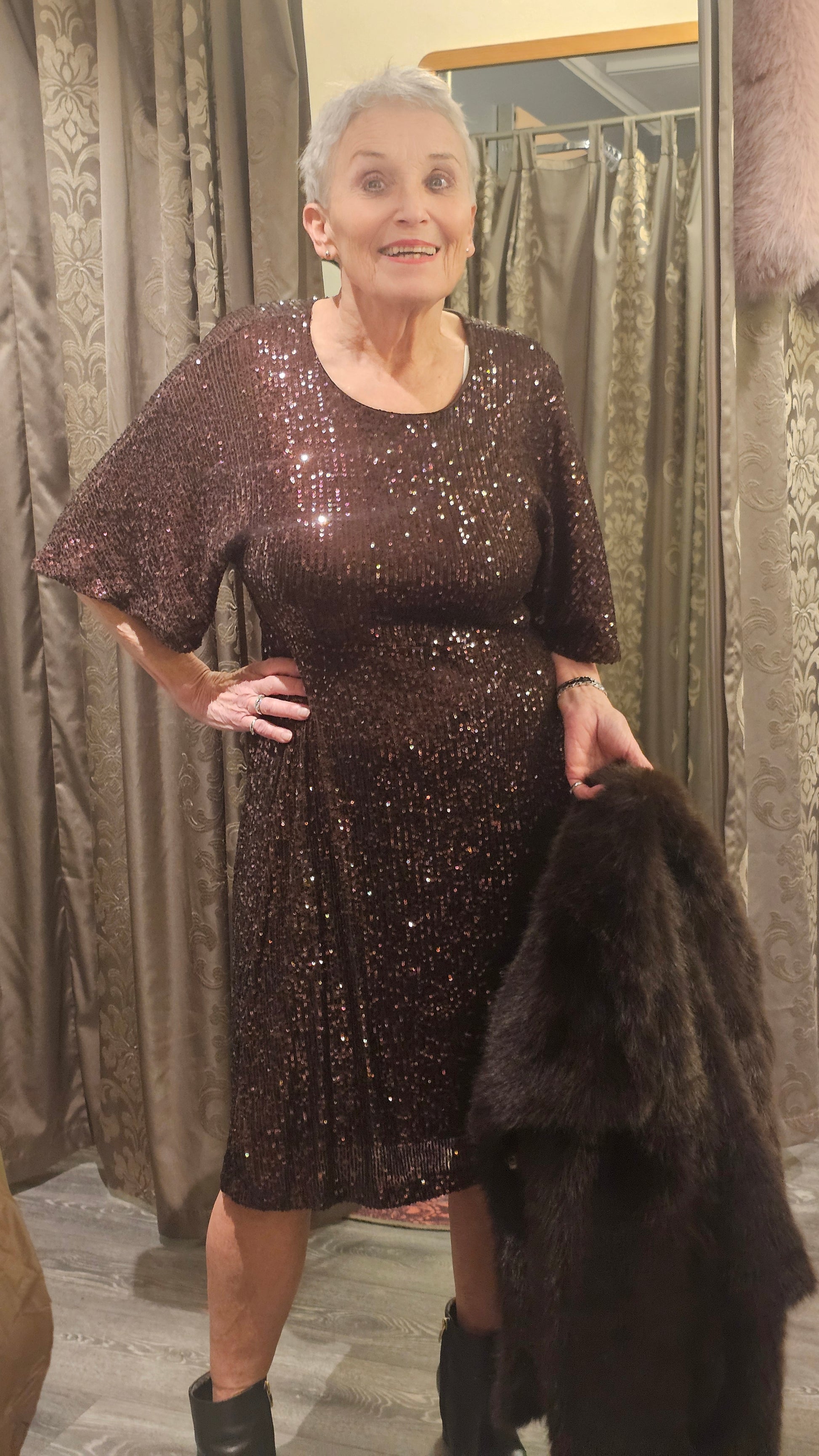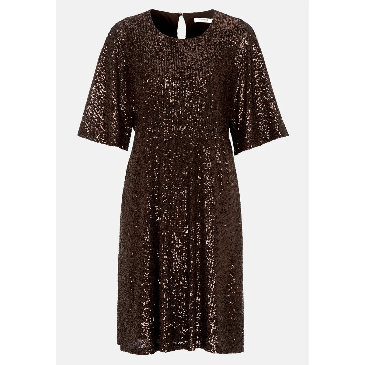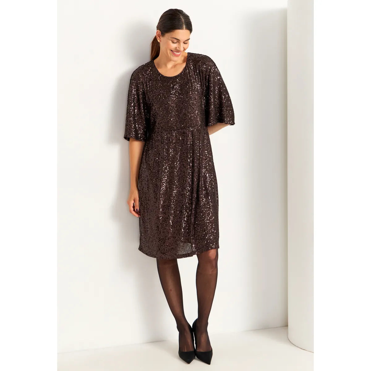 Joustava trikoomekko paljeteilla. Ihan upea väri tummanruskea. Pieni nappikiinnitys niskassa. 3/4 osa hihat kauniin leveä malli. Vyötäröllä kulkee sauma.